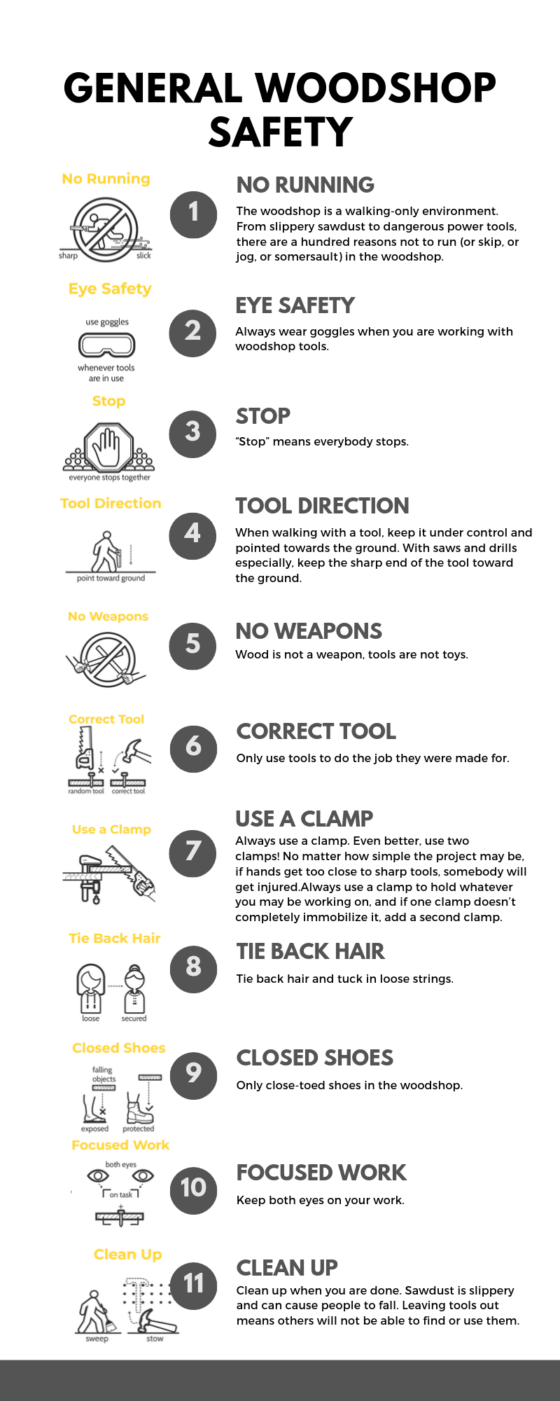 It is essential that teachers and students have clear safety rules when working in a space with tools. In addition to General Woodshop Safety (see the infographic and printable version here), making in an elective or after-school setting has additional safety concerns and challenges. While your school administration may have additional rules to follow in your particular space, the following is a list of guidelines to support your class. For more information on woodshop safety, visit our curriculum site.