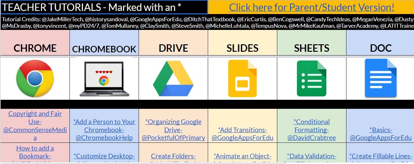 Another exceptional tool to support teachers in this moment, created by a team of educators with credits embedded, can be found here and linked in the above image. With information for both teachers and parents/students this sheet can provide an incredible amount of tech support this year.